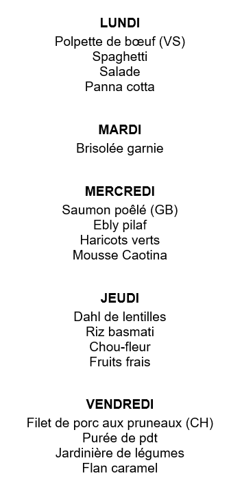 Menus de la semaine Repas de midi du 6 au 10 octobre 2025 Menus en PDF Entrée, plat, dessert, eau minérale et café/thé : CHF 16.- (paiement comptant) Réservations jusqu’à 10 heures au 027 329 00 60 Places limitées !