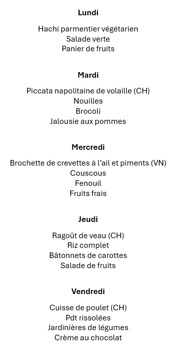 Menus de la semaine Repas de midi du 03 au 07 novembre 2025 Menus en PDF Entrée, plat, dessert, eau minérale et café/thé : CHF 16.- (paiement comptant) Réservations jusqu’à 10 heures au 027 329 00 60 Places limitées !