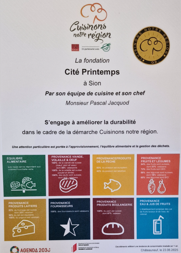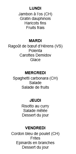 Menus de la semaine Repas de midi du 13 au 17 octobre 2025 Menus en PDF Entrée, plat, dessert, eau minérale et café/thé : CHF 16.- (paiement comptant) Réservations jusqu’à 10 heures au 027 329 00 60 Places limitées !