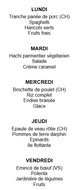 Menus de la semaine MENUS DE LA SEMAINE DU 9 AU 13 MARS 2026 Menus en PDF Entrée, plat, dessert, eau minérale et café/thé : CHF 16.- (paiement comptant) Réservations jusqu’à 10 heures au 027 329 00 60 Places limitées !